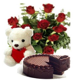 A Gift to youA beautiful way to let your spouse/ sweetheart/ loved one know how much she's missed. 12 Pieces red roses bouquet, 8 inches white teddy w/ iloveyou pillow and chocolate cake.Your gift will come with a greeting card |