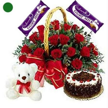 Eternal loveRED ROSES WITH CAKE CADBURY CHOCOLATES AND TEDDY BEAR.24 Exclusive Red Roses with round Cake , 2 * 65 g Cadburys Assorted Chocolates and a Cute 8" Teddy Bear.The gift is sure to fill the heart of the recipient with your thoughts. (We deliver only Freshly Baked Cakes.) |