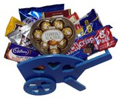 Chocolate Basket-3Heart ferrero, Cadbury Roast Almond, Kisses Milk Chocolates, M & M's, Ritter Sport raisins & Hazelnuts, Crunch Crisp, Butter Finger, Baby Ruth, Kit Kat Bar, Cadbury. |