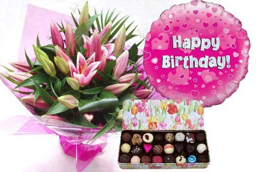 Pink Happy Birthday Gift Package - Flowers, Belgian Chocolates and Balloon chocolates 100 gm