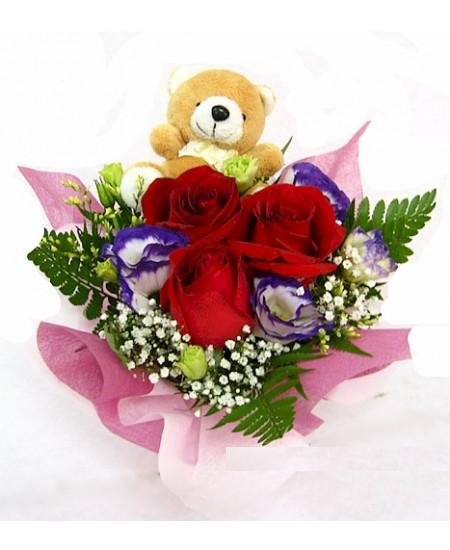 Mini table arrangementMini table arrangement - Mixed colour 12 roses arranged with a mini 8 " bear with fillers and greens in a decorative wrapping. |