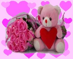 Pretty pink LoveBunch of 12 Pink Roses along with 9 Inches pink Teddy Bear and heart pillow. |