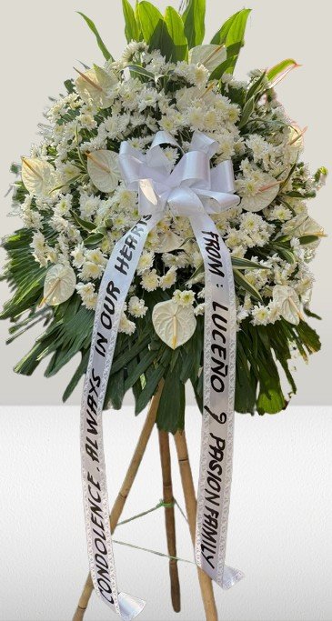 a ribute in whiteyellow roses, carnations, seasonal flowers, - are beautifully composed and accented by Bells of Ireland. Design is one-sided and is appropriate to send this as a sympathy. |