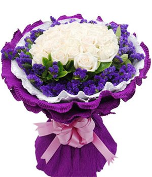 36 White roses36 White roses, purple forget me rich periphery, lining a white or light-colored lines curling paper, round paper packaging for external use purple curling |