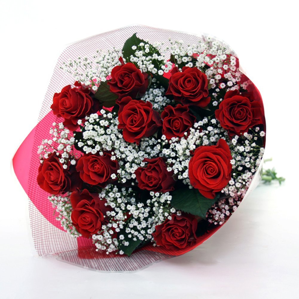 Romantic 12 Red Rose BouquetThis luxurious Romantic 12 Rose Bouquet is made up of the most beautiful red Roses nestled amongst soft white gypsophila and presented in a red floral wrapping. This is the classic way to say 'I Love You'. Each bouquet is individually made and sent with flower food, care instructions and your own personal gift message. |